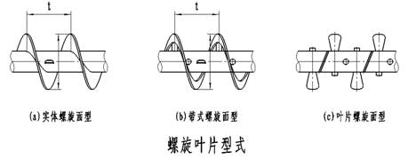 ⑴螺旋輸送機的螺旋葉片有實體螺旋面型、帶式螺旋面型及葉片螺旋面型三種,分別如下圖(a)、(b)、(c)所示。實體螺旋面稱為S制法,其螺旋節距為葉片直徑的0.8倍,適用于輸送粉狀和粒狀物料。帶式螺旋面又稱D制法,其螺旋節距與螺旋葉片直徑相同,適用于輸送粉狀及小塊物料。葉片式螺旋面應用較少,主要用于輸送粘度較大和可壓縮性物料,在輸送過程中,同時完成攪拌、混合等工序,其螺旋節距約為螺旋葉片直徑的1.2倍。